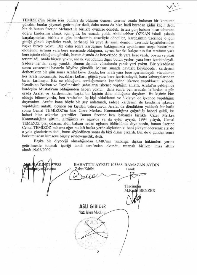Ertesi gün babam bana ve Mehmet Özdal’a erzak, yiyecek, içecek, su götürmemizi söyledi, biz de Mehmet ile birlikte babamın söylediği hisar tabur komutanlığının bulunduğu yere gittik. Oraya vardığımızda askerler bize neden geldiğimizi sordular. Biz de erzak getirdiğimizi söyledik, bu esnada biraz ilerimizde kardeşim Mustafa’nın yerde elleri ve ayakları bağlı bir şekilde yattığını gördüm. Kardeşime iki kişi taşlarla ve sopalarla vuruyorlardı, bunun üzerine biz oraya doğru uluşmak için Mehmet ile birlikte hamle yaptık, ancak askerler oraya geçmemize izin vermediler. Bu esnada Cemal Temizöz isimli komutan ne olduğunu sordu, askerler de yiyecek getirdiğimizi söylediler, bunun üzerine bunları da öldürün diye askerlere söyledi. Kardeşim yerde elleri ön taraftan bağlanmış vaziyette yatıyordu, orada bulunan askerlere kardeşimizi kimin dövdüğünü niye dövdüğünü sorduk, onlar da itirafçı olan Bedran ve Tayfur isimli şahısların kardeşimi döven şahıslar olduğunu söylediler. Bu şahıslar kardeşimi döverken Cemal Temizöz de vurun öldürün diye Bedran ve diğer şahsa emir veriyordu.